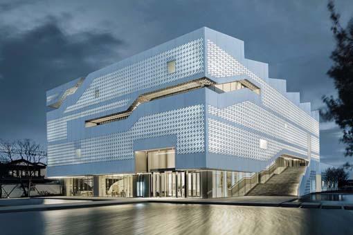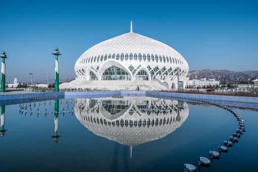 臨夏大劇院坐落于甘肅省臨夏市規劃新城的核心區域,用地面積52,300平方米,地上建筑面積 15,000 平方米,建筑總高度約 46 米。在建筑造型設計上,采用識別力強的簡潔幾何球體,配以經典的比例形態及圖案紋理,但要把這樣精致且具象的造型放大成一個直徑90米、總高46米的公共建筑,無疑給設計師帶來了巨大的挑戰。