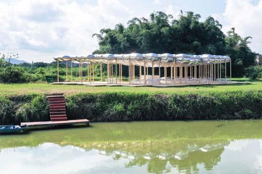 本項目位于廣東省鶴山市古勞水鄉三姓堂村,其主要功能是為人們提供一個喝下午茶或休閑集會的公共空間。古勞水鄉有其特殊的地域肌理,池塘與房屋呈現出一種既規則又自由的交織網絡地貌,這種相互滲透的有機狀態雖為人造卻看似遠古就已存的自然。在土地的運用上這里的人們把更多的比例留給了魚塘,而房屋的建造則在保持著空間舒適性的同時盡量集約化的占用地面。
