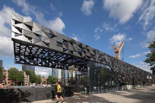MoederscheimMoonenArchitects 在鹿特丹歷史悠久的老港口區(Maritime District)設計了新的港口展館。建筑師們設計了一座新的緊湊型建筑,取代了曾經位于其位置的三個過時的展館。展館增加了透明度和可見性,以便可以清楚地看到歷史悠久的港口和建筑物中發生的活動。在新館內,多種功能匯聚一堂。展館內設有鹿特丹港的港口參觀中心,游客可以在此了解這座城市令人印象深刻的海港。參觀者還會發現海事博物館(MaritimeMuseum)的工作坊。在這里,焊工、鐵匠和木匠在博物館港口維護歷史悠久的船隊。這些工作室向公眾開放,所有的室內功能都是相連的,將歷史和現在的海港結合在一起。參觀者可以直接穿過港口參觀中心進入海事博物館的車間! 此外,建筑物兩端有餐廳,咖啡廳的空間。