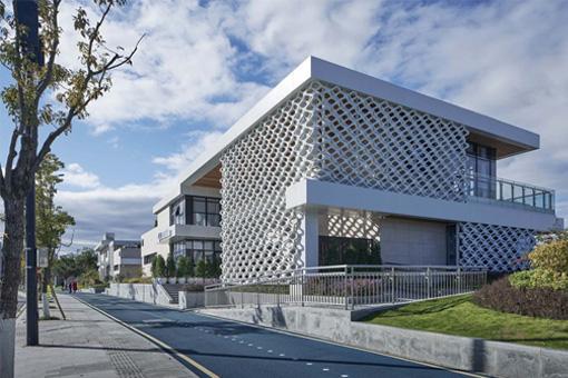 為了讓參觀者獲得最佳的觀感體驗,展廳設(shè)計師隔絕周邊環(huán)境,打造一個相對內(nèi)向封閉的空間。建筑的主要功能是住宅銷售展示,產(chǎn)業(yè)展示和辦公。主入口位于西側(cè),為了消除周圍雜亂環(huán)境的視覺影響,廣場的四周設(shè)計了具有幾何感的小山坡,隨著人們深入場地緩緩抬高,逐漸遮擋住周邊環(huán)境。